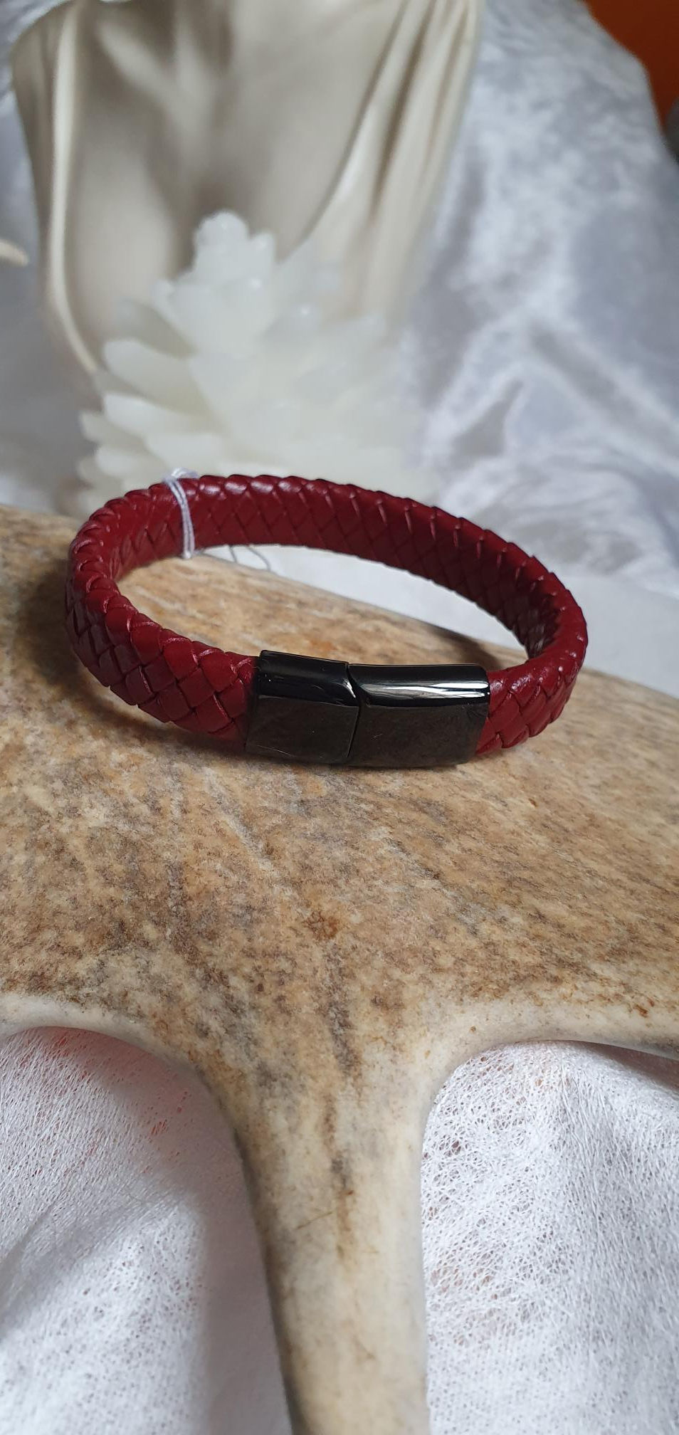 Bracelet cuir tressé rouge foncé et fermoir acier noir - 17 cm