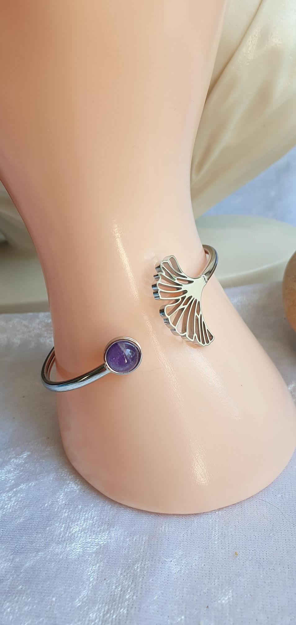 Bracelet rigide en acier inoxydable argenté - Pierre et feuille ginkgo