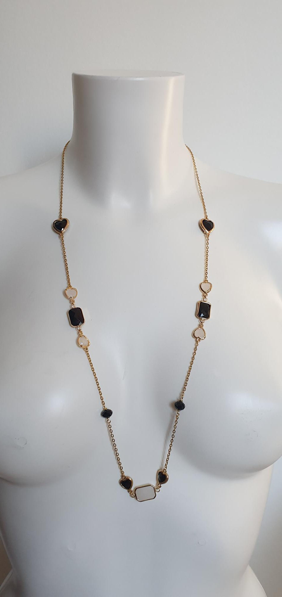 Collier ou sautoir chaine acier inoxydable doré et pierres noires et blanches